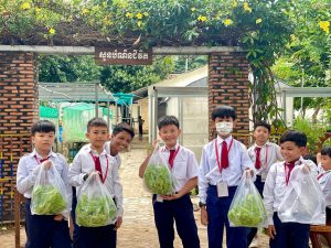 សកម្មភាពសិស្សប្រមូលផលដំណាំសាលាដលើទឹក។ ចំពោះការដាំដំណាំក្នុងសាលាពុំមានប្រើជីគីំមីនោះទេ គឺប្រើតែជីកំប៉ុសដែលផលិតដោយសិស្សក្នុងសាលារៀននេះផ្ទាល់។ បន្ទាប់ពីដកសាលាដចេញពីថ្នាលលើទឹក សិស្សបានយកទៅលាងទឹកសម្អាតឲ្យបានស្អាត និងត្រៀមដាក់លក់ ក្នុងនោះមានលោកគ្រូ អ្នកគ្រូ មាតាបិតា និងអាណាព្យាបាលទិញយកទៅធ្វើម្ហូប។ ក្រោយពេលលក់បន្លែអស់សិស្សានុសិស្សសប្បាយរីករាយណាស់ ហើយថវិកាដែលទទួលបានសិស្សទុកដាំបន្លែផ្សេងៗទៀតជាថ្មី។ សាលារៀននេះមានគោលបំណងគឺចង់ឲ្យសិស្សបានយល់ដឹង និងបានអនុវត្តន៍ដោយផ្ទាល់អំពីការដាំដំណាំលើទឹក ការផលិតជីកំប៉ុសធម្មជាតិ ការថែទាំ និងការប្រមូលផល។