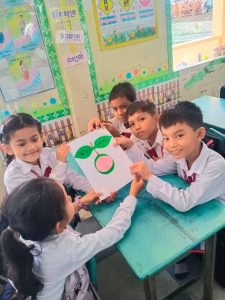សកម្មភាពសិស្សថ្នាក់ទី2(ខ) កាត់ក្រដាសបិតធ្វើរូបផ្លែឈើ។ សិស្សានុសិស្សបានប្រើប្រាស់សម្ភារៈដូចជាកន្ត្រៃ កាវជាដើមយ៉ាងប្រុងប្រយ័ត្ន និងកែច្នៃបិតជារូបផ្លែឈើយ៉ាងស្រស់ស្អាត។