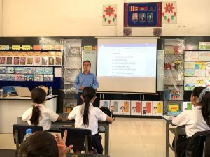 សកម្មភាពសិស្សថ្នាក់ទី១(ក) រៀនអានពាក្យតាមរយៈ Tablet នៅក្នុងបណ្ណាល័យ។ សិស្សានុសិស្សរីករាយនៅក្នុងការរៀន ព្រោះសាលាបានបញ្ចូលបច្ចេកវិទ្យាក្នុងការរៀនតាំងពីកម្រិតថ្នាក់ទី១។