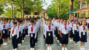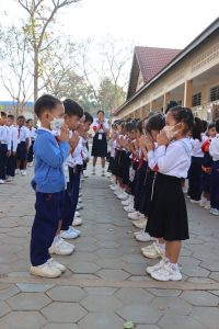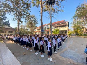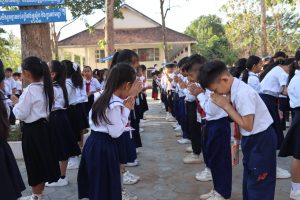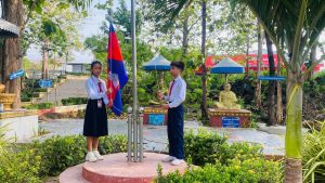 សកម្មភាពសិស្សឈរតម្រង់ជួរគោរពទង់ជាតិនៃព្រះរាជាណាចក្រកម្ពុជា