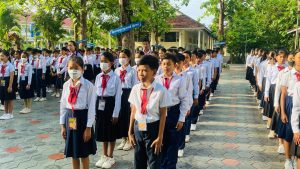 សកម្មភាពសិស្សឈរតម្រង់ជួរគោរពទង់ជាតិនៃព្រះរាជាណាចក្រកម្ពុជា